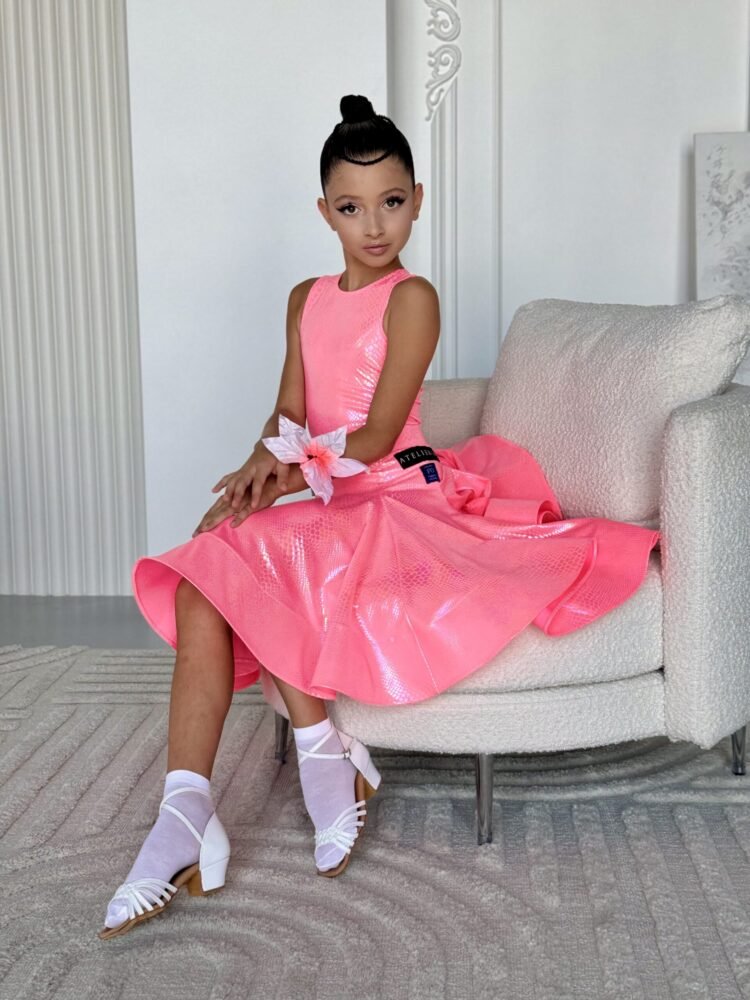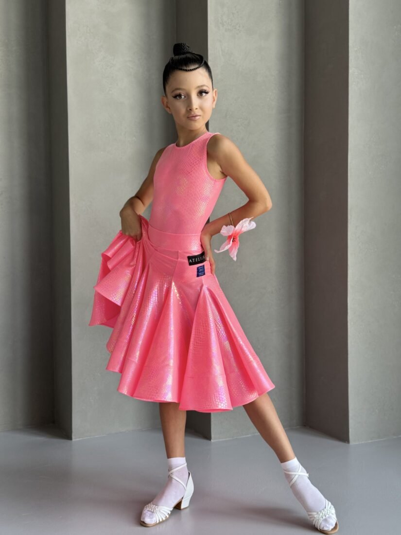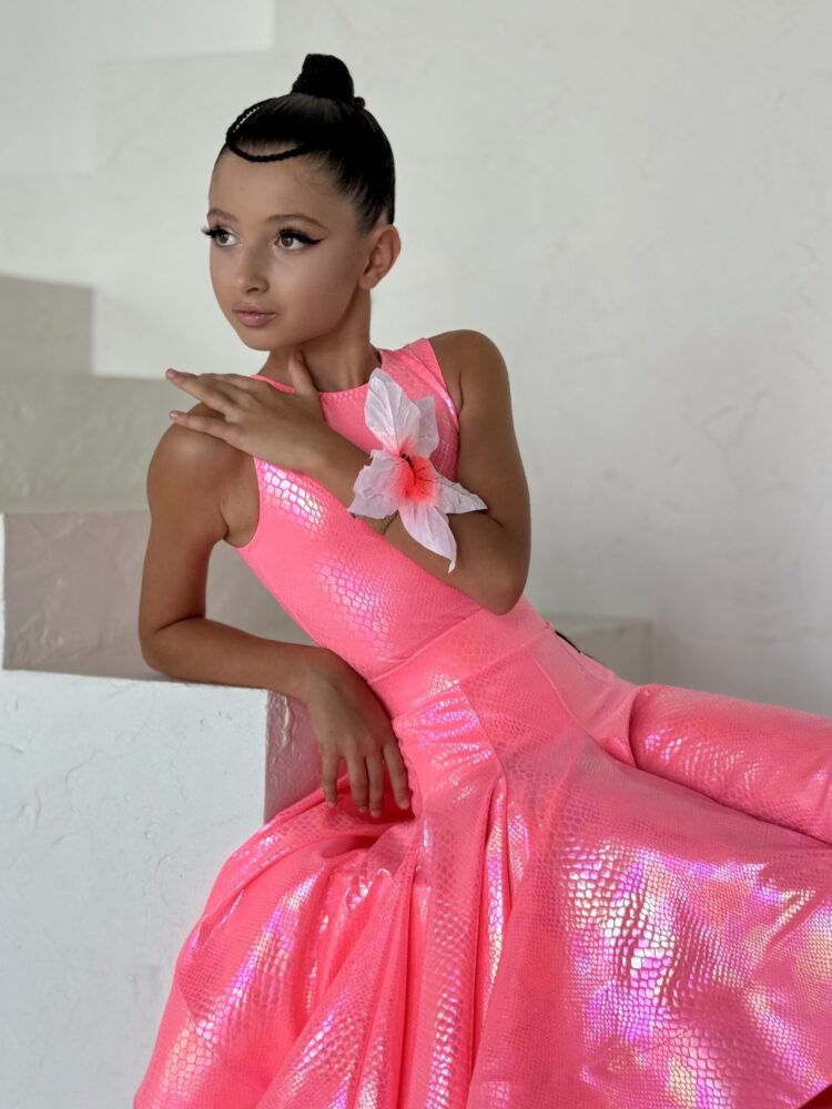 Refined elegance meets performance in the Atelier SM Celeste Python Juvenile Ballroom Dance Dress, designed for young dancers who value timeless style, comfort, and a graceful presence on the dance floor.