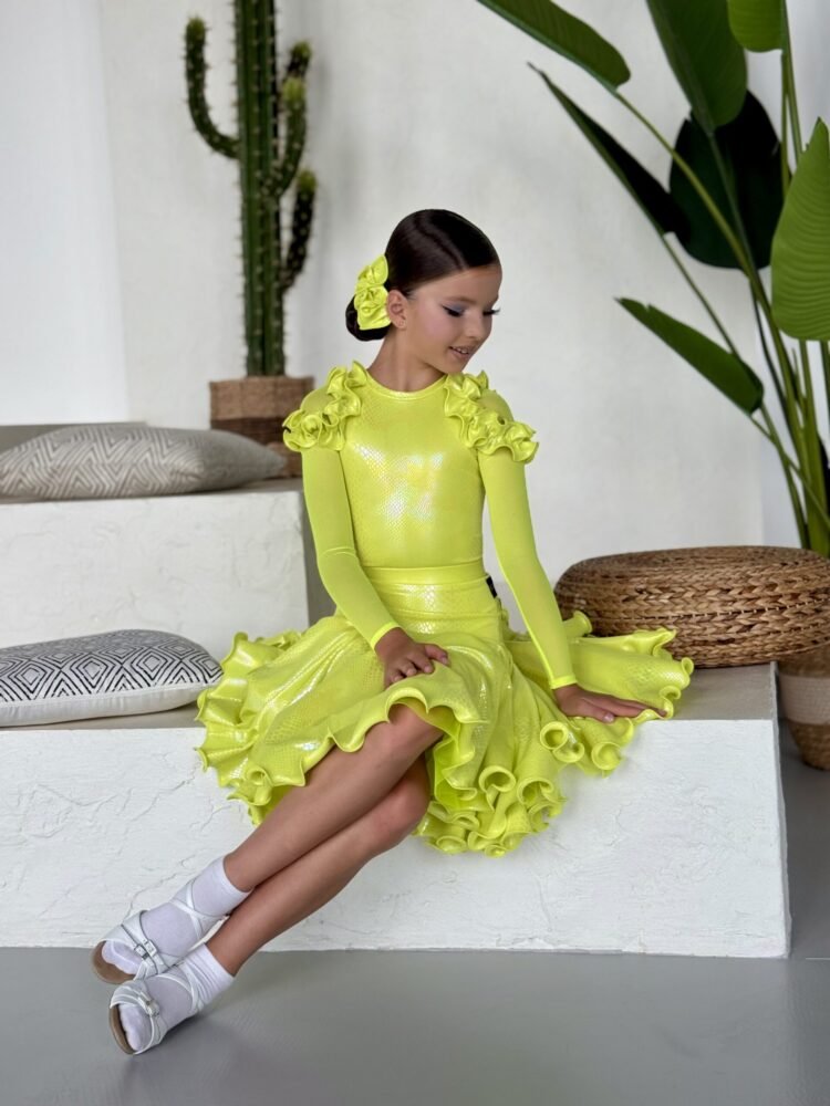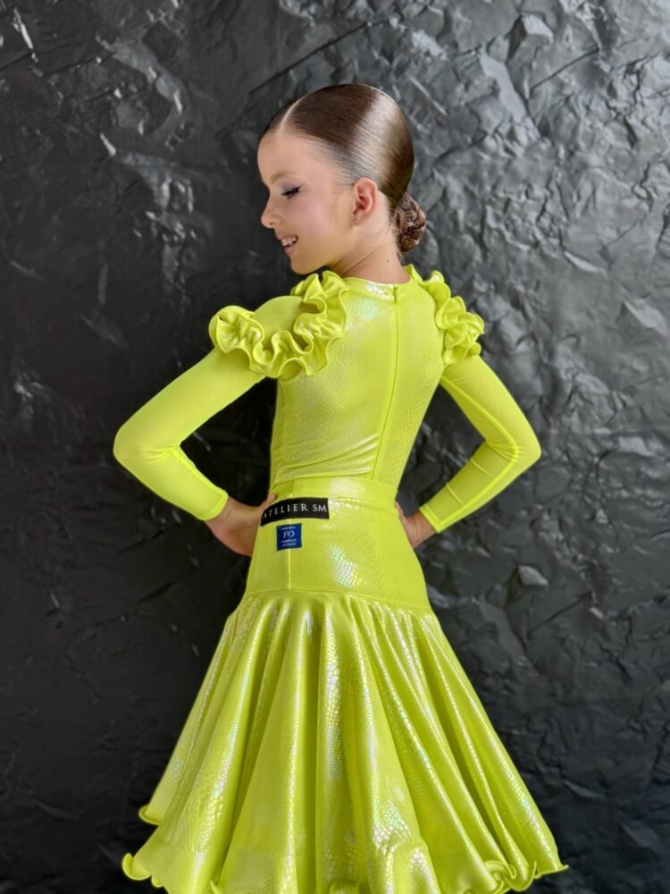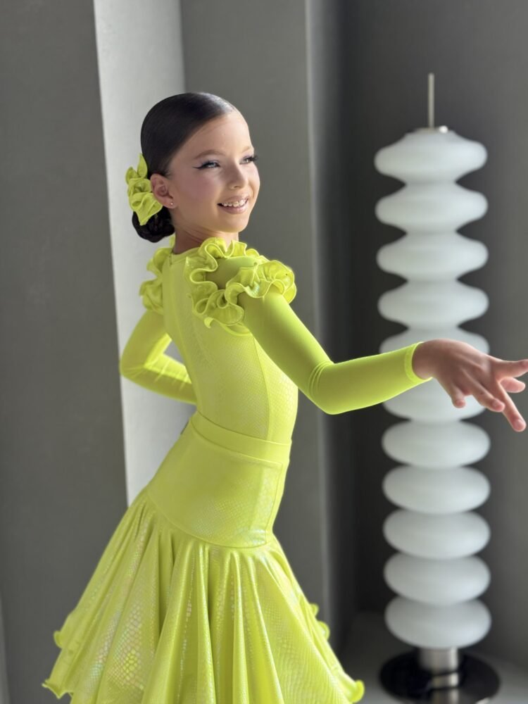 This juvenile ballroom dance dress features a beautifully fitted silhouette with long sleeves and statement ruffled shoulders, adding volume, softness, and a couture-inspired touch. The structured bodice enhances posture, while the full flared skirt creates graceful movement and flow during every performance.