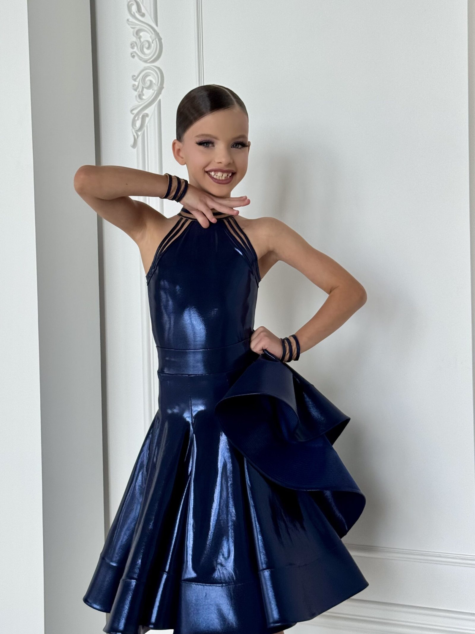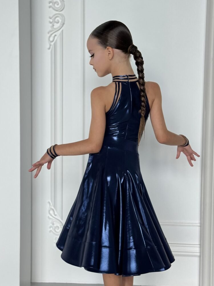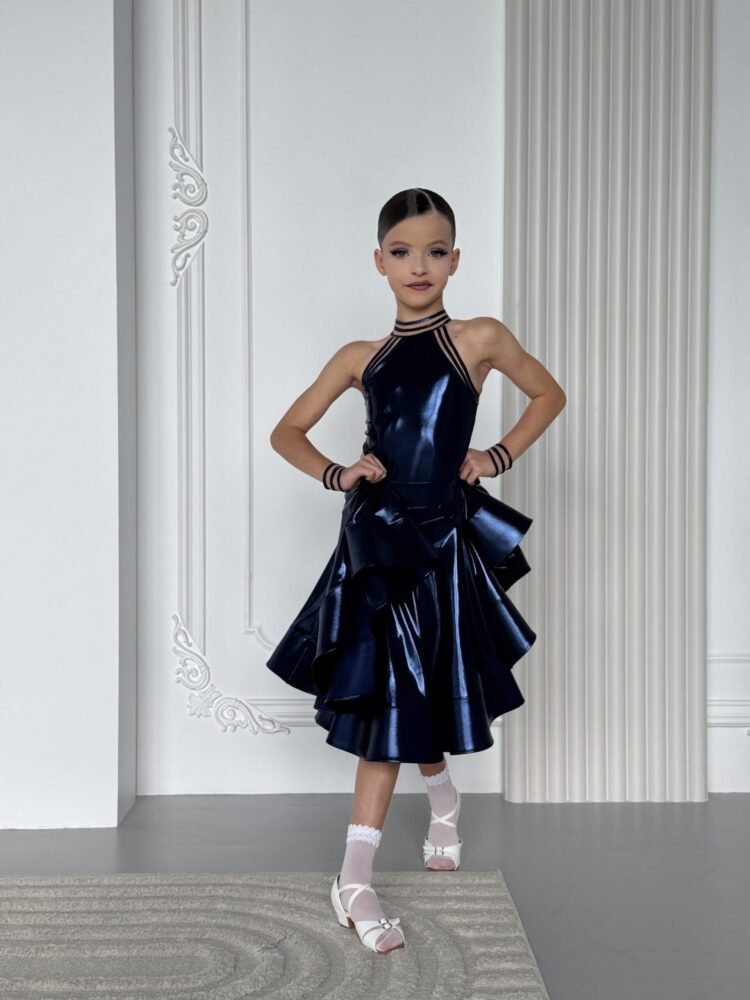 This juvenile ballroom dance dress features a sleek fitted silhouette with a striking halter neckline and multi-strap detailing, creating a modern and confident look. The structured bodice enhances posture and clean lines, while the layered flared skirt delivers dramatic movement and volume with every step and turn.