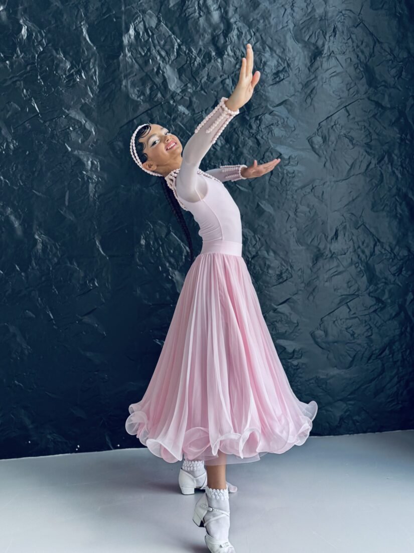 This juvenile ballroom dance dress features a refined, fitted bodice that enhances posture and creates a clean, elongated line. The design is elevated with delicate detailing, adding a subtle couture touch while maintaining a sophisticated and competition-ready aesthetic.