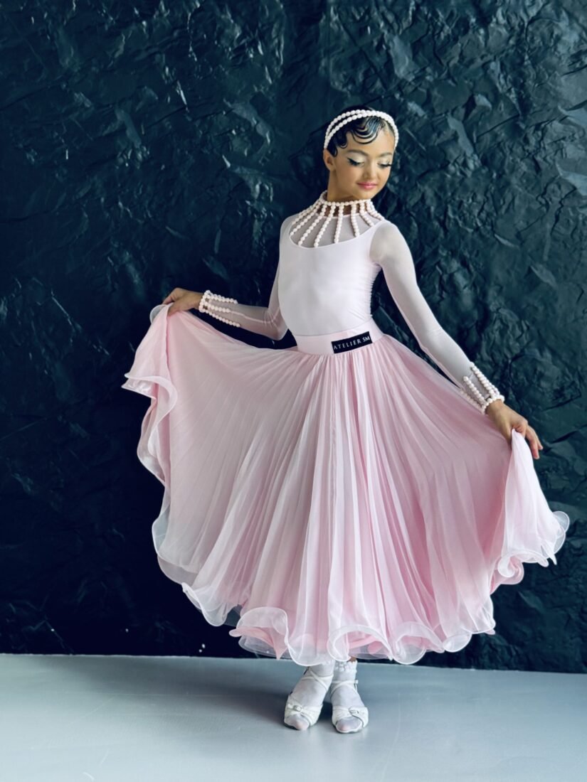 Elegant juvenile ballroom dance dress by Atelier SM, crafted from premium lightweight performance fabric for soft, flowing movement. Features long sleeves, delicate pearl detailing, and a multi-layered skirt that creates an airy, graceful silhouette. Part of the New Collection, available in carnation and black, ideal for competitions and performances.