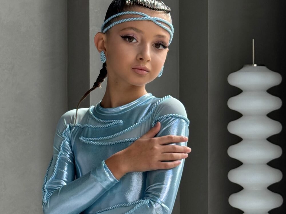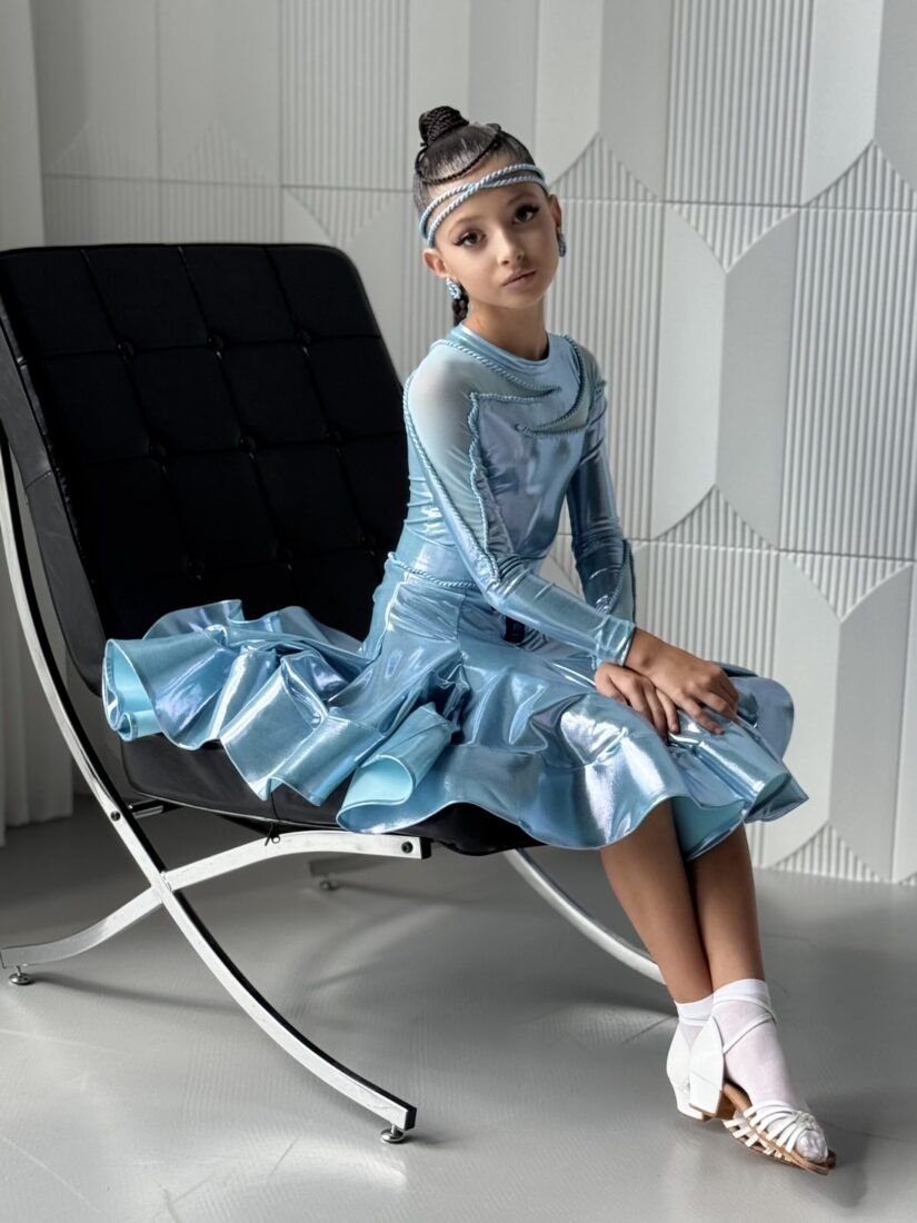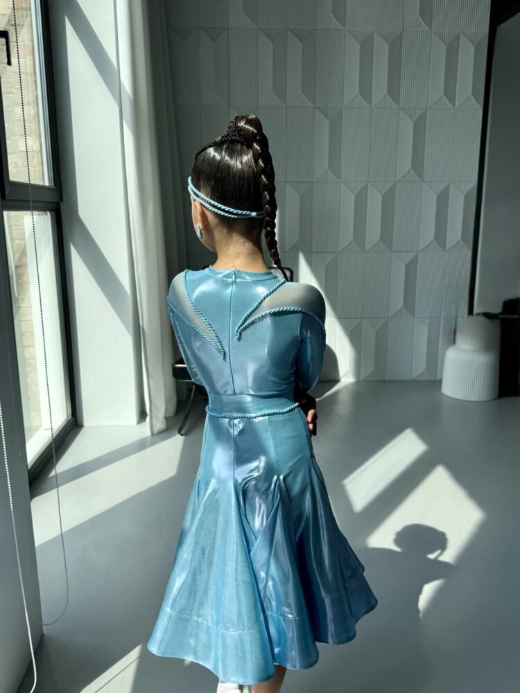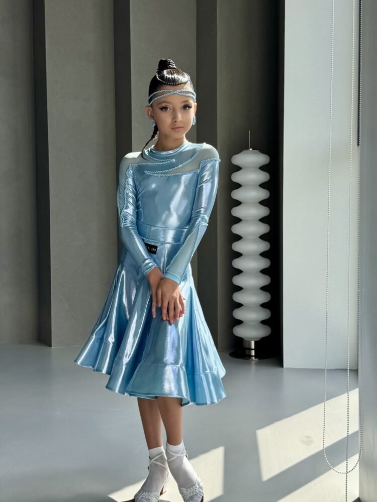 This juvenile ballroom dance dress features a sleek fitted silhouette with long sleeves and a high neckline, delivering a polished and competition-ready look. The design is elevated with distinctive rope detailing across the bodice and sleeves, adding structure, direction, and a unique visual identity.